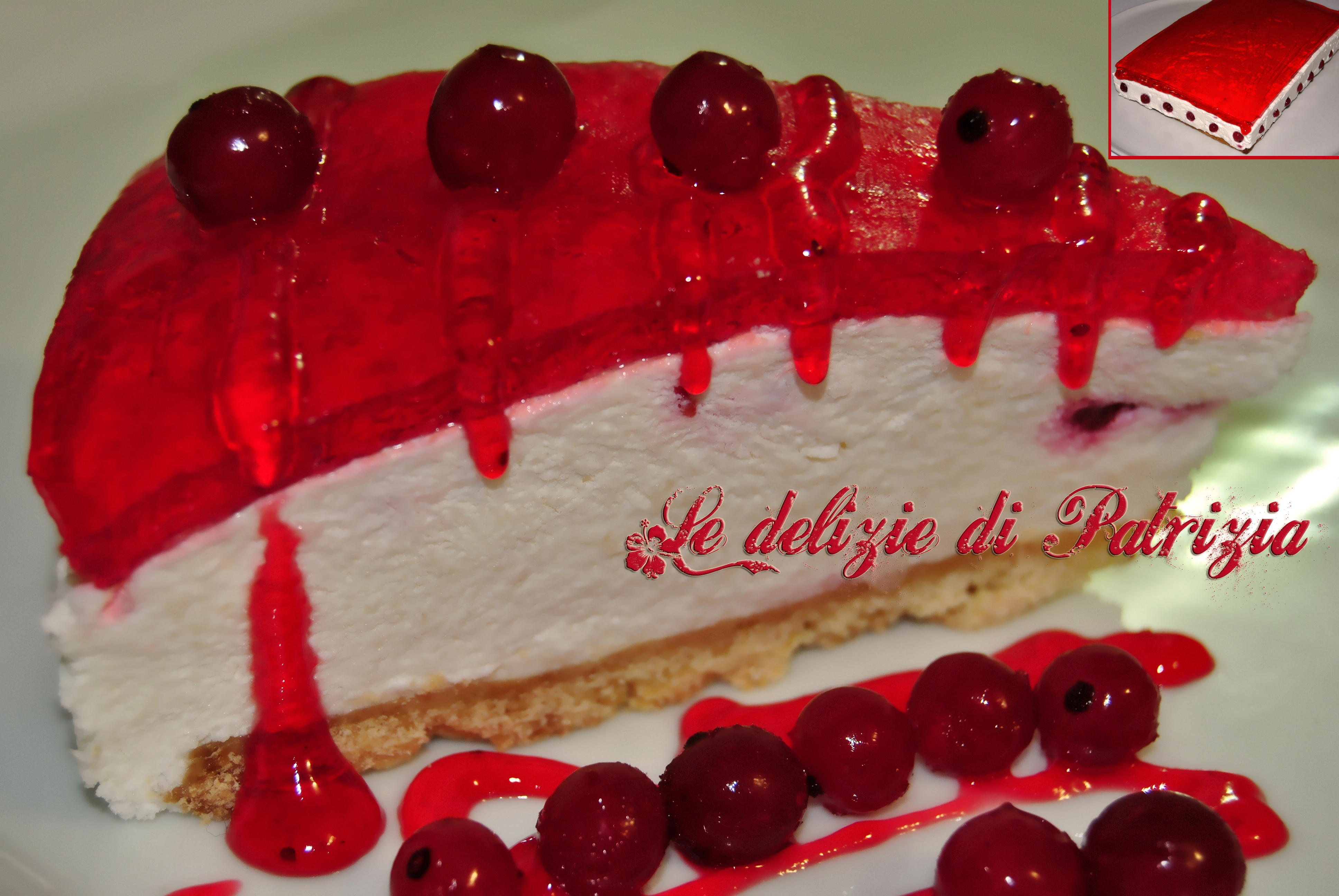 Preparazione per la farcia: mettere in ammollo la colla di pesce per 10 min. in acqua fredda. In una terrina versare lo yogurt, lo zucchero a velo e la vaniglia. Sciogliere la colla di pesce in un tegamino a fuoco bassissimo (sarà sufficiente l’acqua che trattengono i fogli). Lasciarla raffreddare qualche minuto ed unirla allo yogurt girando velocemente con una frustra. Ora montare la panna ed aggiungerla allo yogurt. Infine aggiungere i ribes. Rivestire il bordo della tortiera con dell’acetato. Versare il composto nella tortiera sul biscotto e lasciar riposare in frigo per almeno 5-6 ore. Una volta rassodata la farcia colarci sopra la gelatina e riporre nuovamente in frigo. Servire quando la gelatina sarà solidificata.