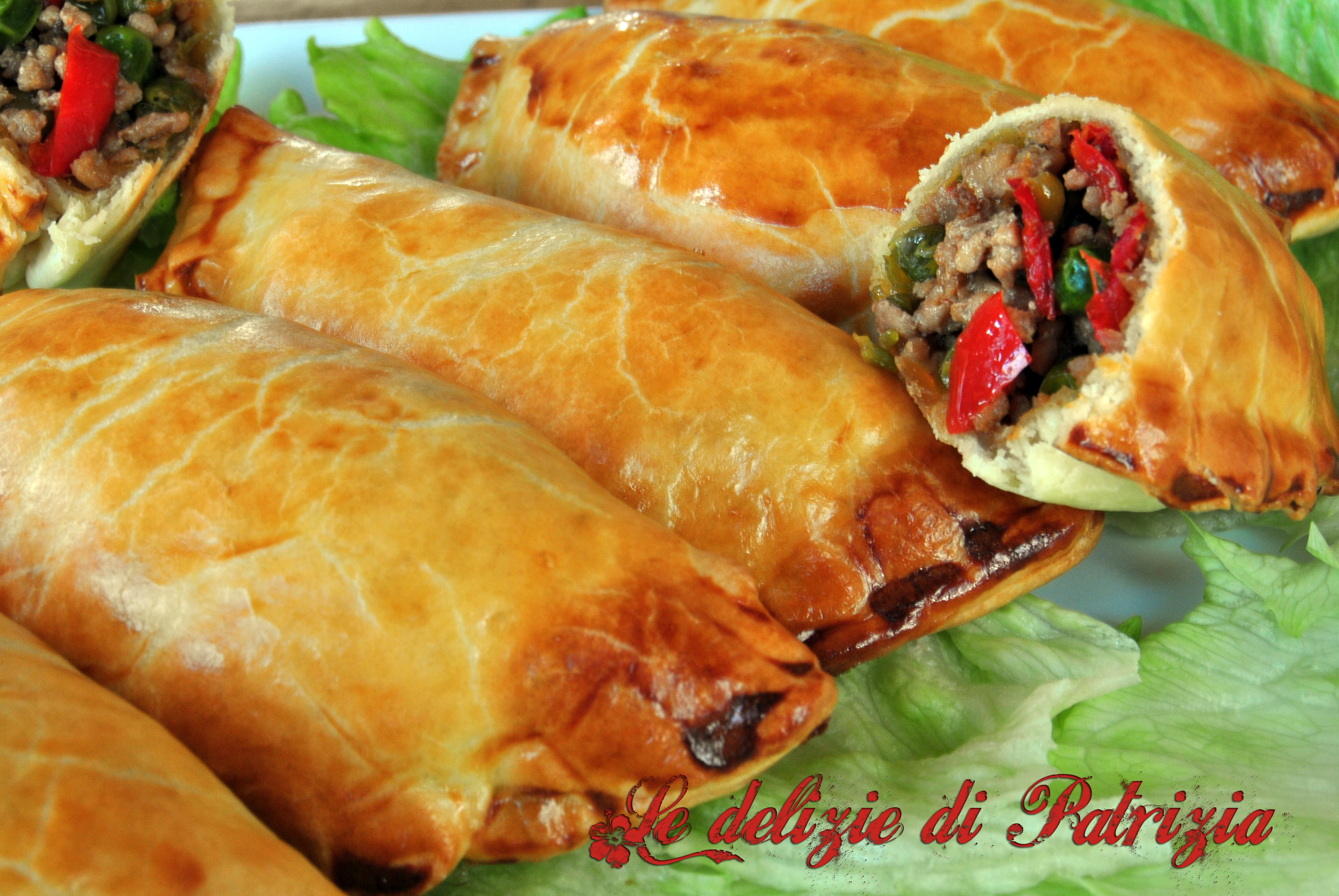 Preparazione: tagliare a dadini minuscoli il soffritto, il peperone ed il peperoncino (togliendo i semini) e farli rosolare in una padella capiente con dell’olio d’oliva. Ora unire il macinato e far cuocere a fuoco vivo fino a quasi completa cottura. Quando la carne sarà bella rosolata, bagnarla con 4-5 cucchiai di soia (darà sapore e sostituirà il sale). Aggiungere al tutto 1 bicchiere d’acqua. Coprire e lasciar cuocere a fuoco basso finché il liquido non sarà quasi del tutto assorbito. In un’altra padella mettere un filo d’olio d’oliva ed uno spicchio d’aglio e quando sarà dorato toglierlo ed aggiungere i piselli. Farli saltare per bene ed unirli alla carne macinata rosolata. Far raffreddare il tutto. Stendere la pasta brisè e coppare dei cerchi della grandezza preferita. Riempire col composto di carne. Chiudere bene i bordi aiutandosi con una forchetta. In una ciottolina sbattere un uovo e spennellare la superficie dei fagottini. Infornare.