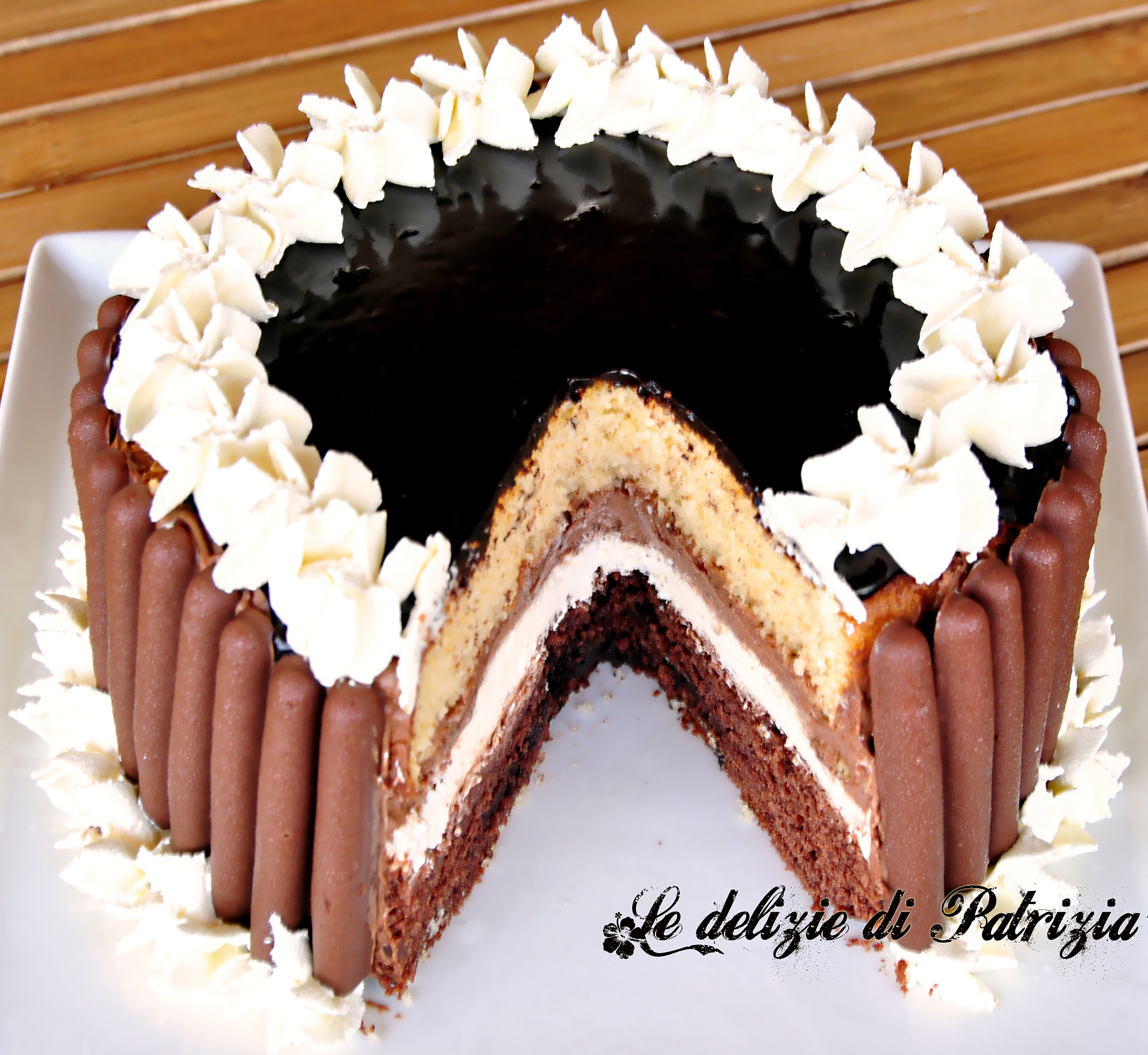 Preparazione per le basi (da preparare e cuocere separatamente): sbattere le uova con lo zucchero, aggiungere i liquidi ed infine le polveri setacciate. Infornare. Lasciar raffreddare quindi farcire con la bagna a piacere, uno strato di ganache al cioccolato bianco ed uno strato di ganache al cioccolato fondente. Decorare a piacere. Personalmente ho decorato con glassa a specchio, biscotti al cioccolato e ganache al cioccolato bianco.