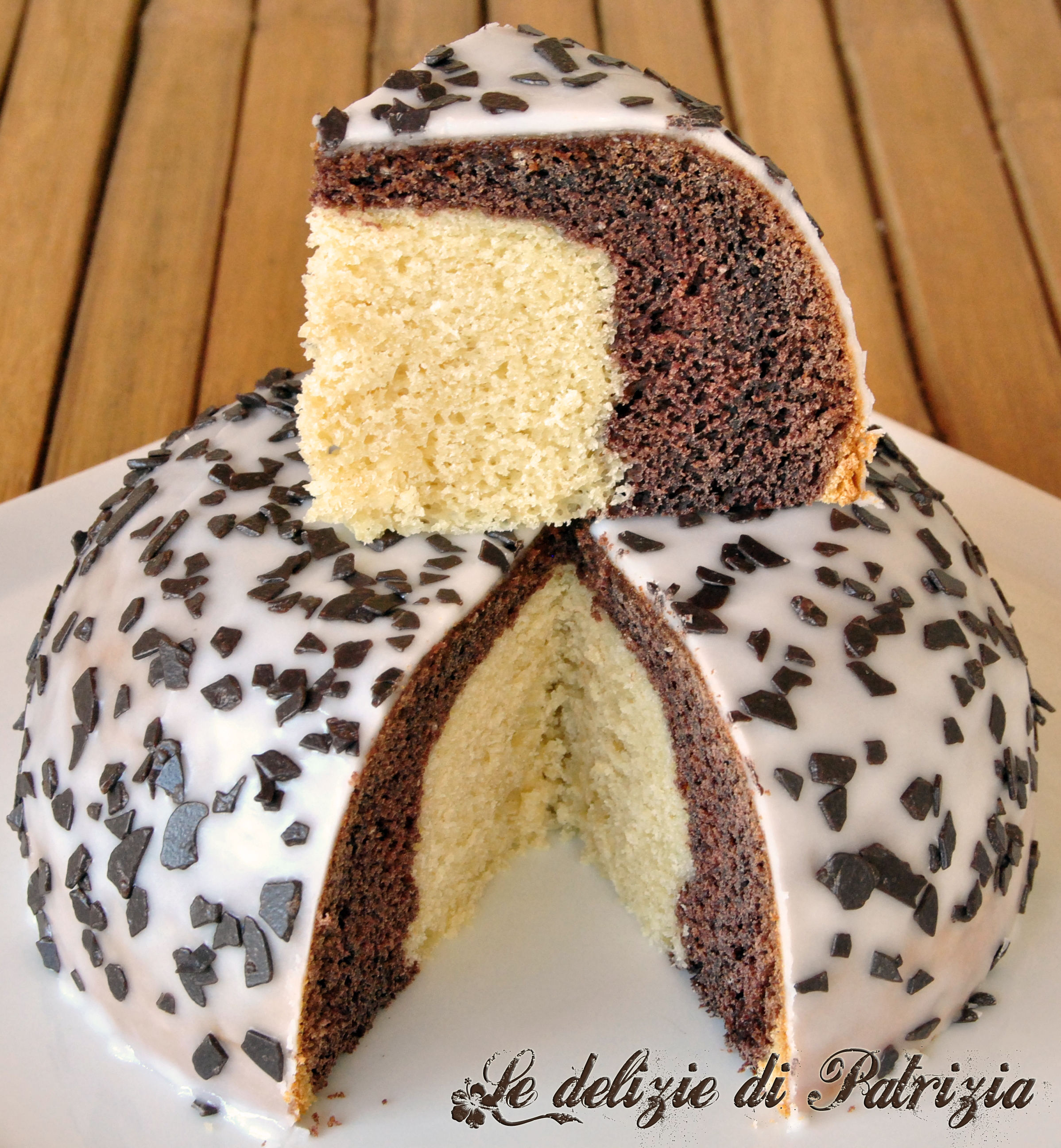 Preparazione: per questo zuccotto ho usato il robot e non le fruste per impedire alla panna, contenuta tra gli ingredienti, di montarsi. Se non avete il robot usate il cucchiaio. Mettere all’interno tutti gli ingredienti (tranne il cacao) e far andare alla massima velocità fino ad ottenere un impasto bello liscio. Ora versare l’impasto ottenuto in due terrine (sono 420 g circa ciascuno) ed in uno aggiungere ed amalgamare per bene due cucchiai di cacao setacciato. Imburrare ed infarinare uno stampo da zuccotto (18 cm diametro) e versarci dentro prima l’impasto al cacao poi quello alla panna. Infornare. Una volta freddo colarci sopra la glassa vanigliata (si ottiene aggiungendo poco per volta allo zucchero a velo del liquore o dell’acqua, quanto basta per ottenere una cremina liscia) e decorare con scagliette di cioccolato.