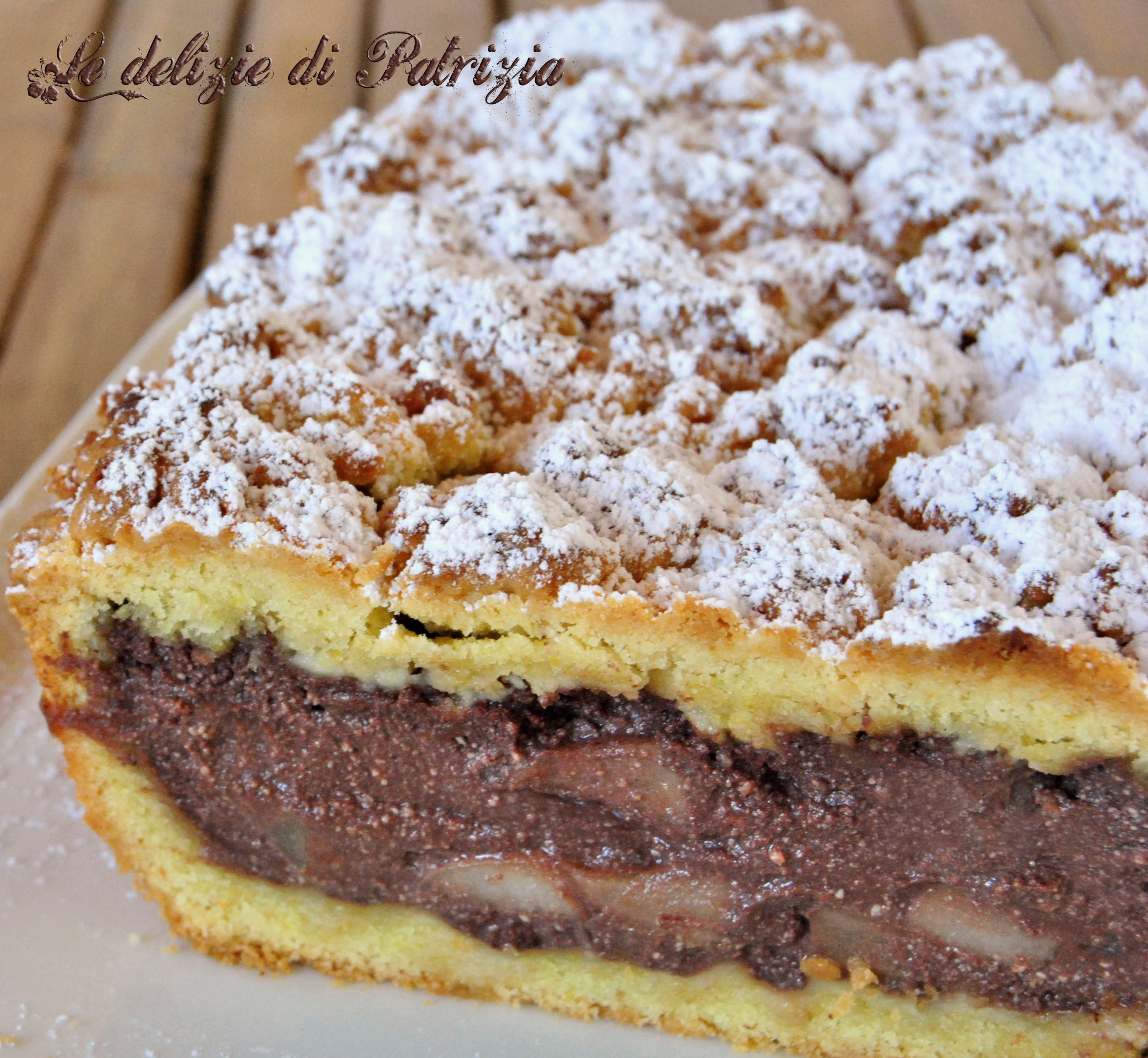 Preparazione: preriscaldare il forno a 160°. Inserire tutti gli ingredienti in una terrina e lavorarli con le dita fino ad ottenere un impasto a grossi granuli. Foderare di carta forno una teglia (una da 21 cm di diametro è sufficiente oppure una rettangolare da 16 larghezza e 21 lunghezza). Prendere con le mani parte dei granuli e rivestire il fondo e i lati della teglia premendo leggermente. Conservare un po’ dell’impasto che ci servirà per la superficie. Riporre la teglia in frigo e preparare il ripieno. Setacciare la ricotta e metterla dentro una terrina, aggiungere lo zucchero, la vaniglia e l’uovo. Amalgamare con cura ed infine aggiungere il cacao setacciato. Ora sbucciare la pera, ridurla in piccoli dadini ed unirla al composto mescolando per bene. Prendere la teglia dal frigo e riempire con il composto preparato poi cospargere sopra i granuli di pasta messi da parte. Infornare per 35 minuti a 160°. Lasciar raffreddare molto bene prima di sformarlo e tagliarlo. Consiglio di preparare questo dolce il giorno prima del consumo per consentire alla ricotta di compattarsi . Prima di servirla spolverare con lo zucchero a velo.