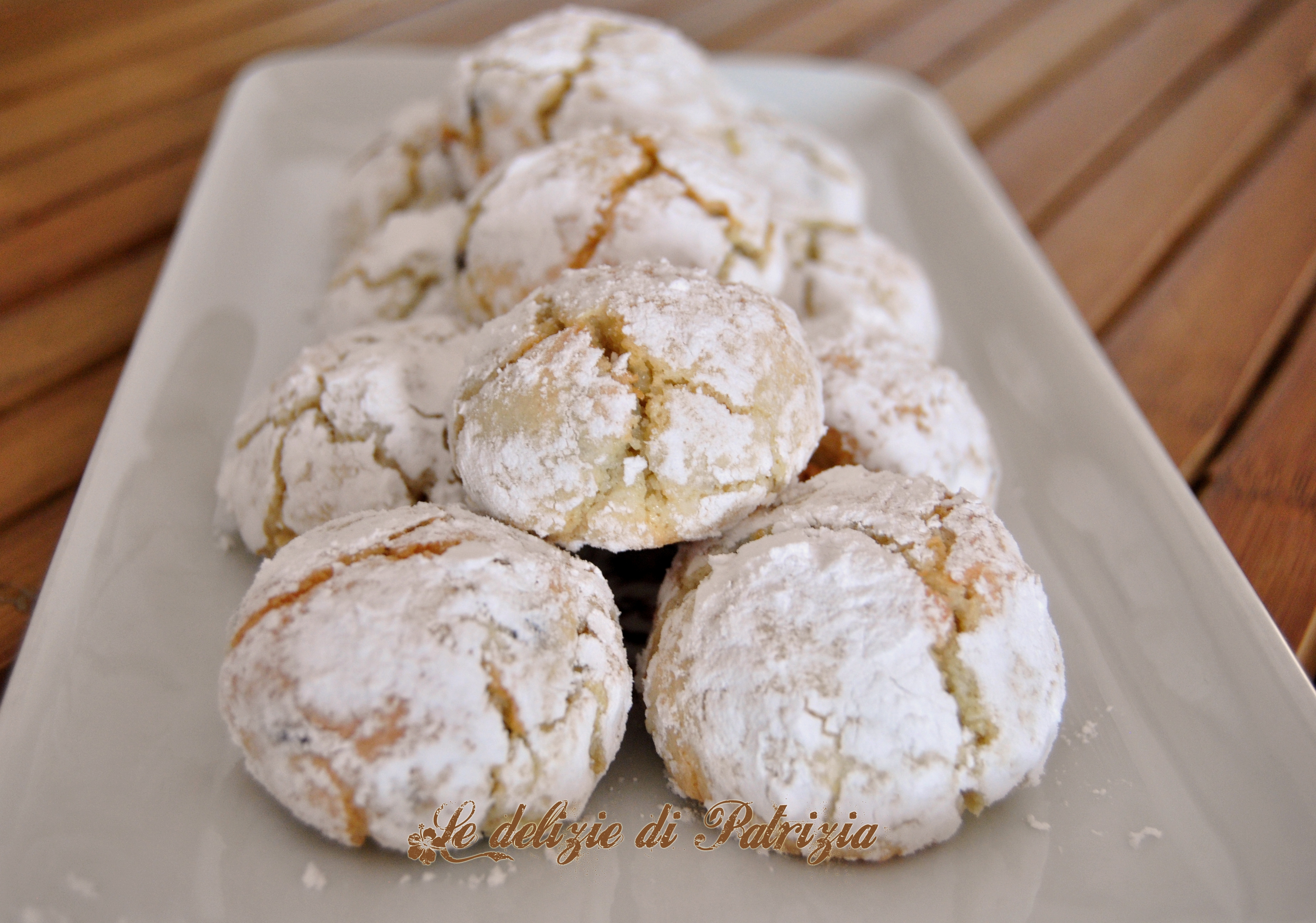 Preparazione: macinare finemente le mandorle (anche quelle amare) con lo zucchero e la vaniglia. Riporre in una terrina ed aggiungere pian, piano l’albume (non versatelo tutto in una volta perché potrebbe servirne un po’ meno, l’impasto deve risultare lavorabile con le mani). Per ottenere una pasta ancora più sottile consiglio di passare l’impasto ottenuto nel robot per qualche minuto. Mettere l’impasto in una terrina ed aggiungere infine le gocce di cioccolato. Quando tutto sarà amalgamato per bene, formare delle palline, passarle in abbondante zucchero a velo e disporle sulla placca foderata di carta forno. Infornare in preriscaldato a 180° per cinque minuti poi abbassare a 160° per altri dieci minuti.