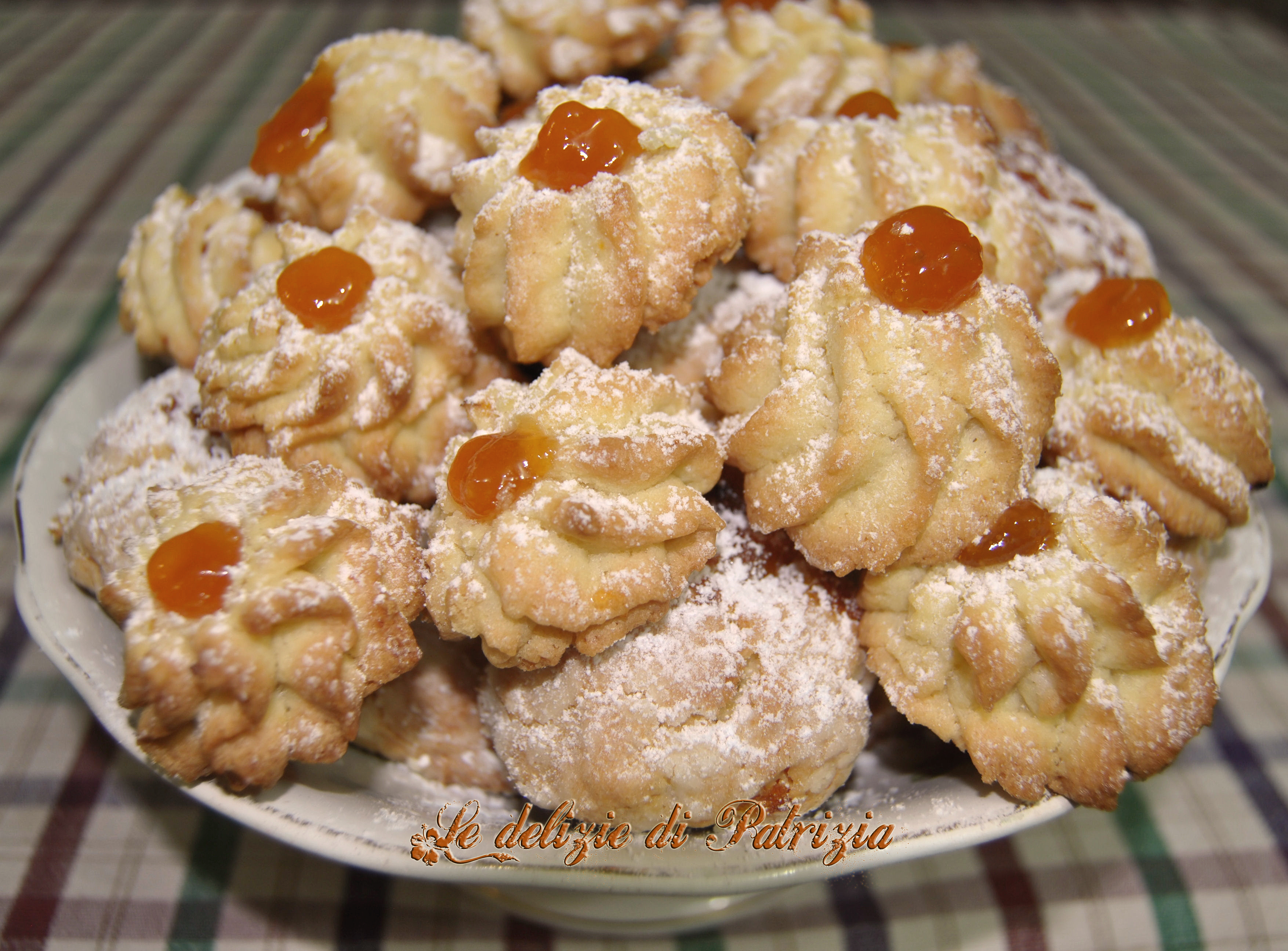 Preparazione: versare tutti gli ingredienti in planetaria (comprese le albicocche tritate finemente) ed amalgamare con la foglia fino ad ottenere un impasto omogeneo. Mettere il composto in una saccapoche con bocchetta a denti larghi e disporre dei ciuffetti di impasto sulla placca, foderata di carta forno. Mettere al centro di ciascun biscotto un po’ di marmellata di albicocche o un pezzetto di albicocca. Per fare queste rosine uso una sacca in tessuto che mi permette di spremere l’impasto senza difficoltà ma se non l’avete (quella di plastica vi si romperebbe) potete stendere la pasta e tagliare con le formine che preferite o usare la sparabiscotti. Nel secondo caso consiglio di mettere l’impasto in frigo per almeno 30 minuti prima di stenderlo.
