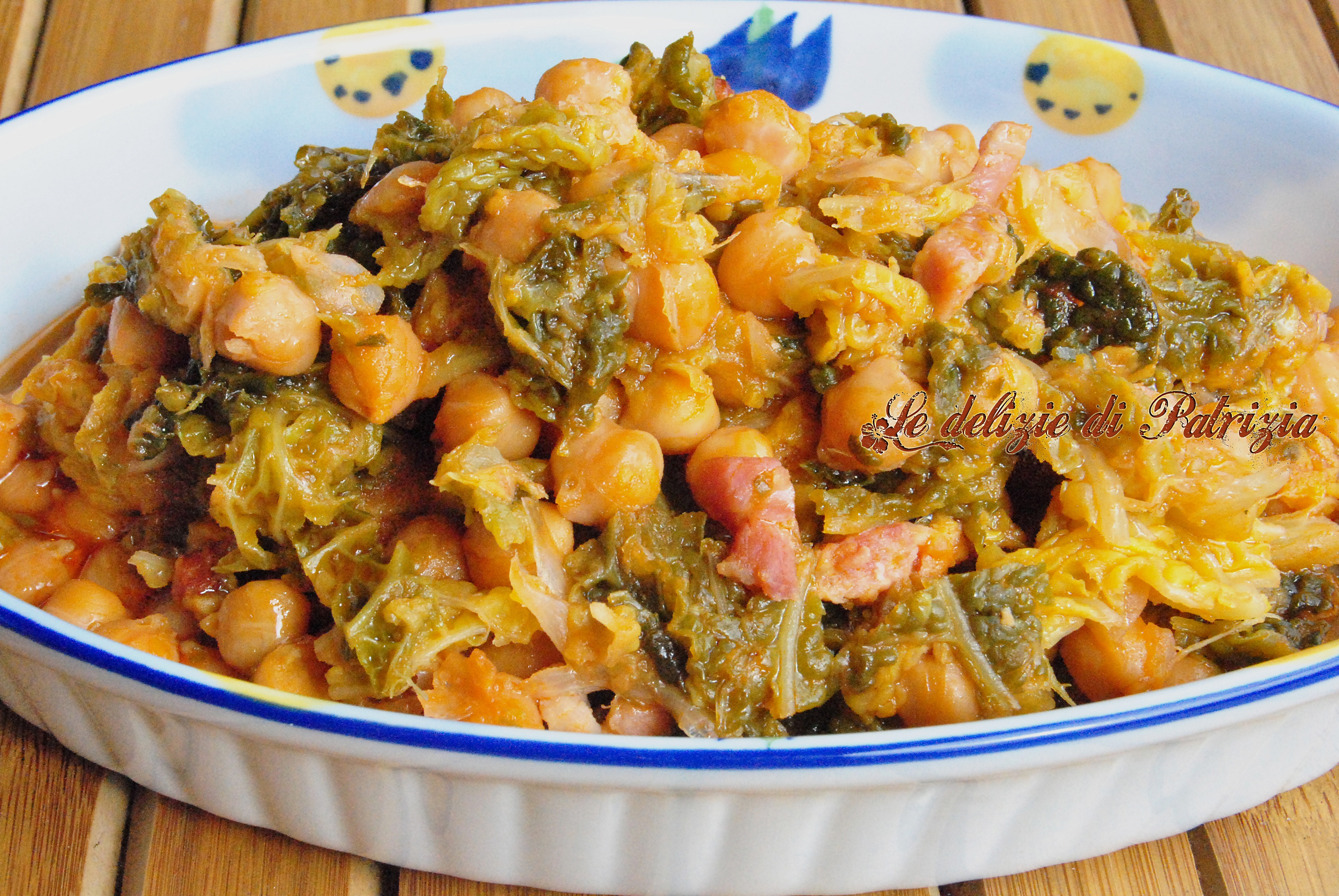 ammollare i ceci in acqua fredda almeno 10-12 ore prima dell’utilizzo. Preparare un litro di brodo vegetale con cipolla, carota, sedano, alloro e prezzemolo. In un tegame far scaldare qualche cucchiaio d’olio e rosolare cipolla, tagliata finemente, e speck. Aggiungere i ceci, ben scolati, il concentrato ed alcuni mestoli di brodo. Lasciarli cuocere per almeno 50 minuti a fuoco moderato aggiungendo brodo di tanto in tanto. Trascorso il tempo e verificata la completa cottura dei ceci, unire la verza tagliata a strisce non troppo sottili. Salare, aggiungere qualche cucchiaiata di brodo, coprire e lasciar stufare per una quindicina di minuti. Il piatto va servito tiepido con un giro d’olio a crudo e una presa di pepe.