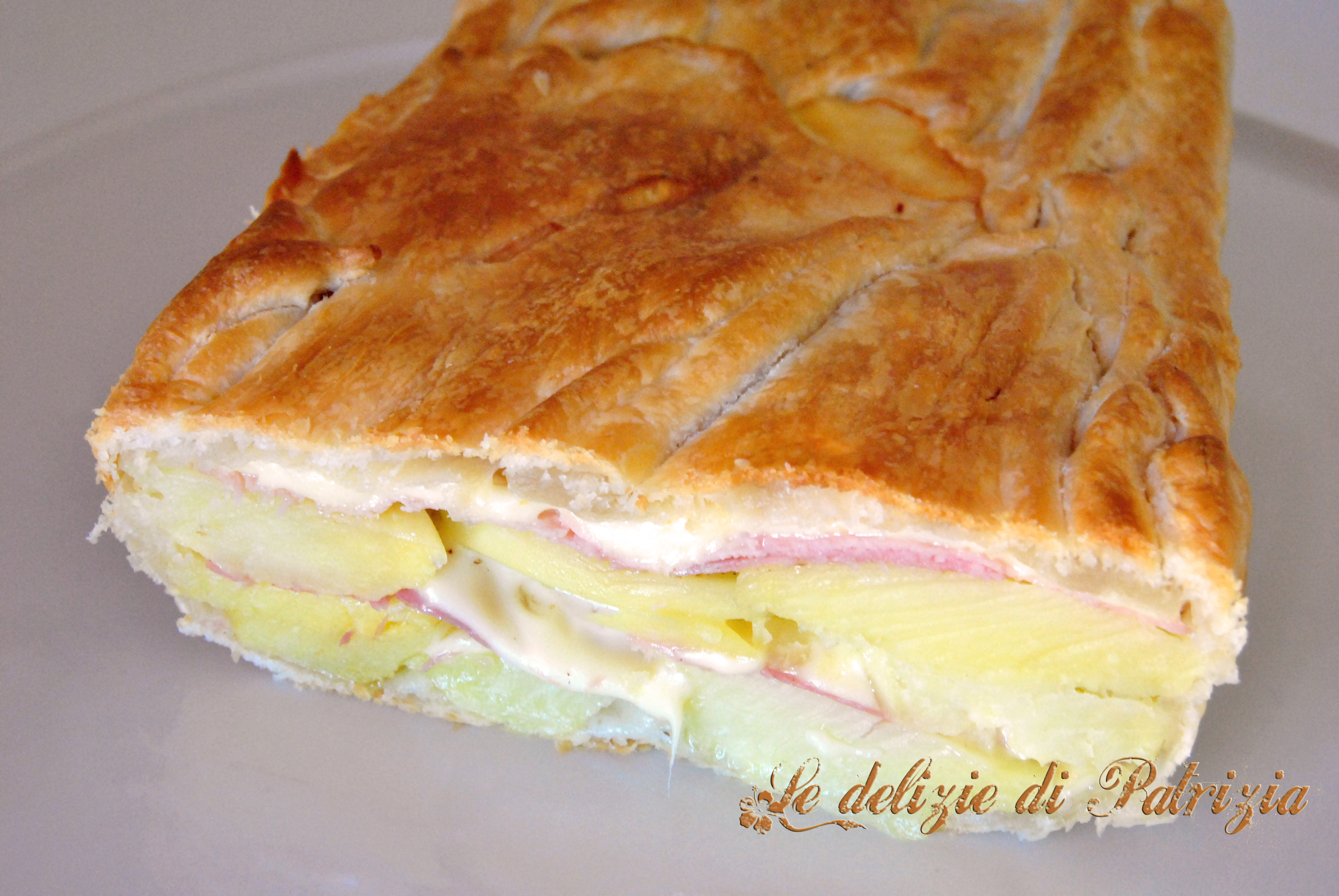 Preparazione: lessare le patate in acqua salata. Spellarle e tagliarle a fette circolari. Foderare una teglia con la pasta sfoglia (mettere da parte l’eccesso che servirà per la copertura) quindi disporre le fette di patate , aggiungere dei fiocchetti di burro, una grattata di noce moscata, uno strato di prosciutto e uno di formaggio. Continuare a stratificare in questo modo fino a riempire la teglia. Coprire il tutto con la pasta sfoglia avanzata ed infornare in preriscaldato a 160° per 15-20 minuti fino ad ottenere una crosticina dorata. Ho usato una teglia da 24 lungh e 17 largh. Dose per 8-10 persone.