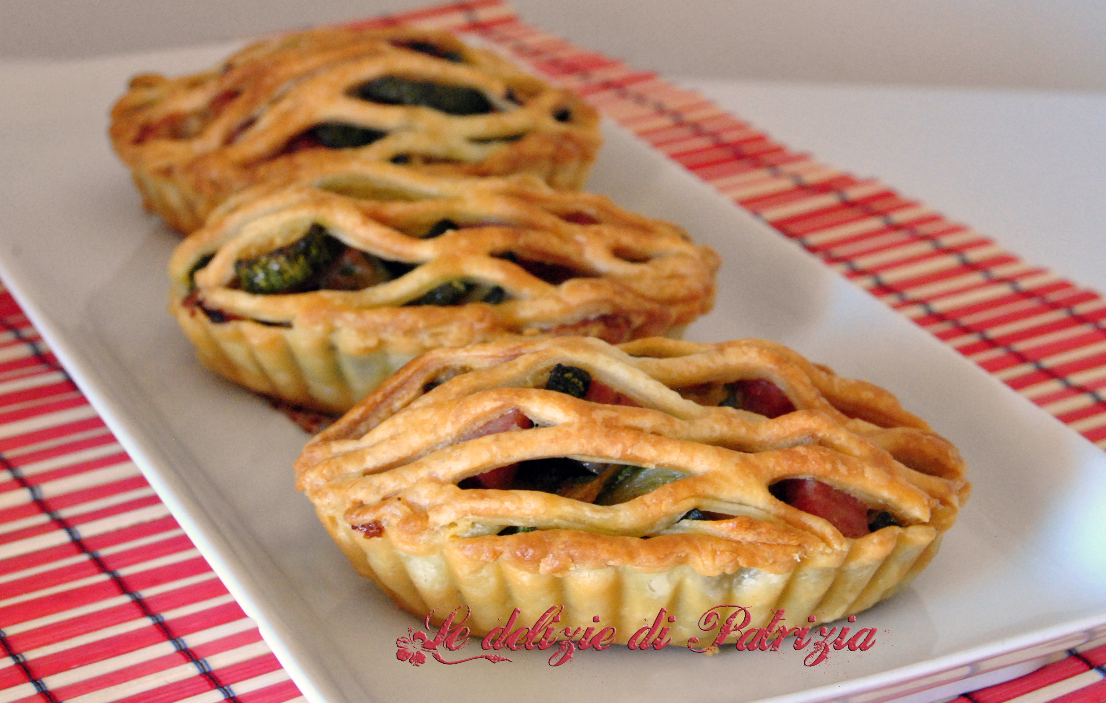 Preparazione: rosolare i cipollotti, tagliati a rondelle, in qualche cucchiaio d’olio quindi aggiungere le zucchine tagliate a tocchetti, il sale (non troppo perché il ripieno contiene il parmigiano), il basilico e far cuocere a fuoco vivace per 10-15 minuti. Lasciar raffreddare quindi aggiungere i cubetti di prosciutto, i cubetti di parmigiano, una grattata di noce moscata e un giro di pepe. Mischiare bene tutti gli ingredienti e riporre in frigo fino al momento dell’utilizzo. Foderare gli stampini con la pasta sfoglia, riempirli col preparato e coprirli con la sfoglia tagliata col rullo per losanghe (o tagliate le striscioline col coltello ed applicatele su tutta la superficie). Spennellare tutte le tortine con l’uovo ed infornare in preriscaldato a 160° per 15-20 minuti.