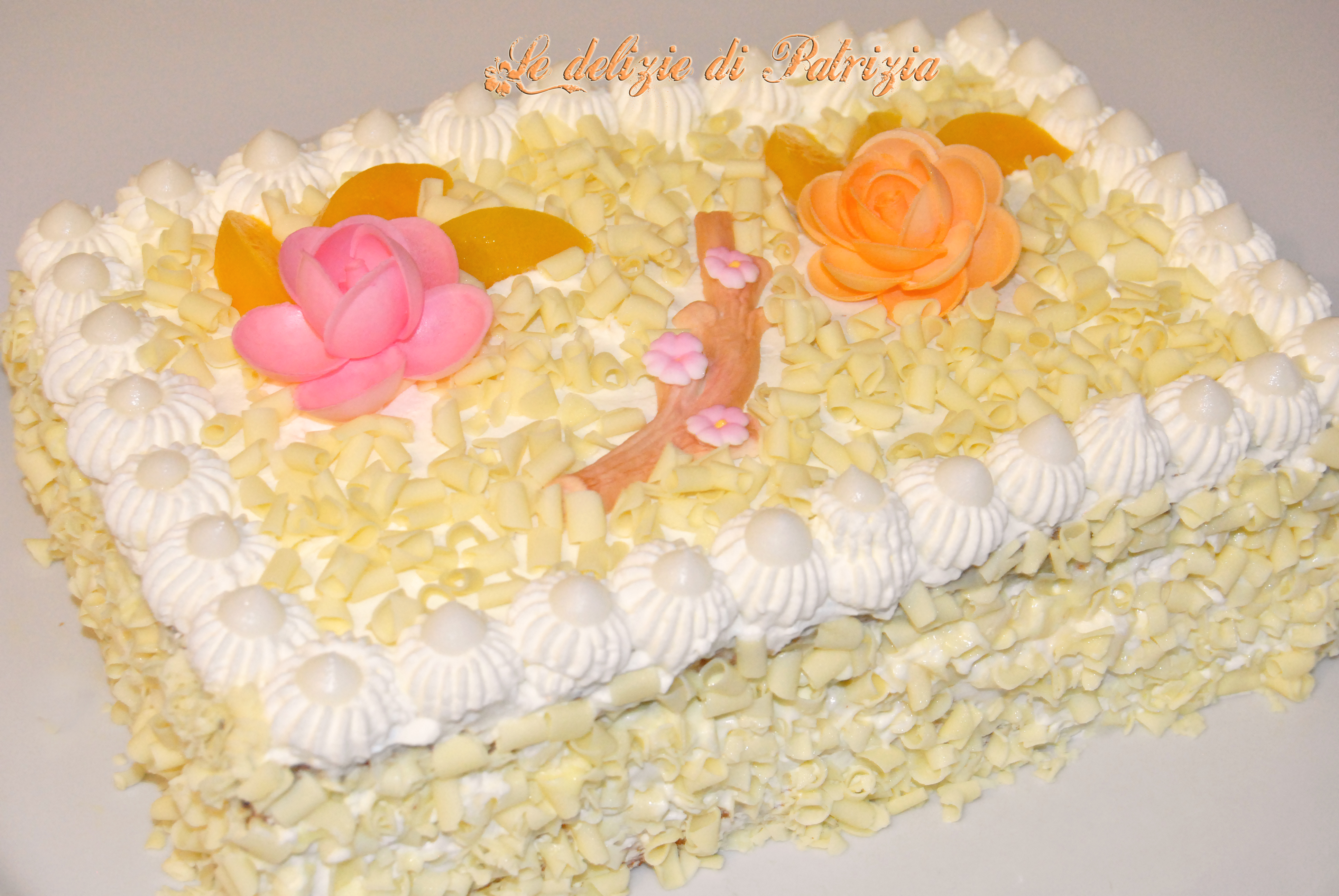 Dividere il pds, spennellarlo, sotto e sopra con la bagna, farcire con la crema quindi ricoprire con dadini di pesca. Coprire e spatolare tutto il dolce con la crema avanzata quindi decorare con riccioli di cioccolato o con ciò che preferite. Ho fatto questa torta per il 25 compleanno della mia bimba.