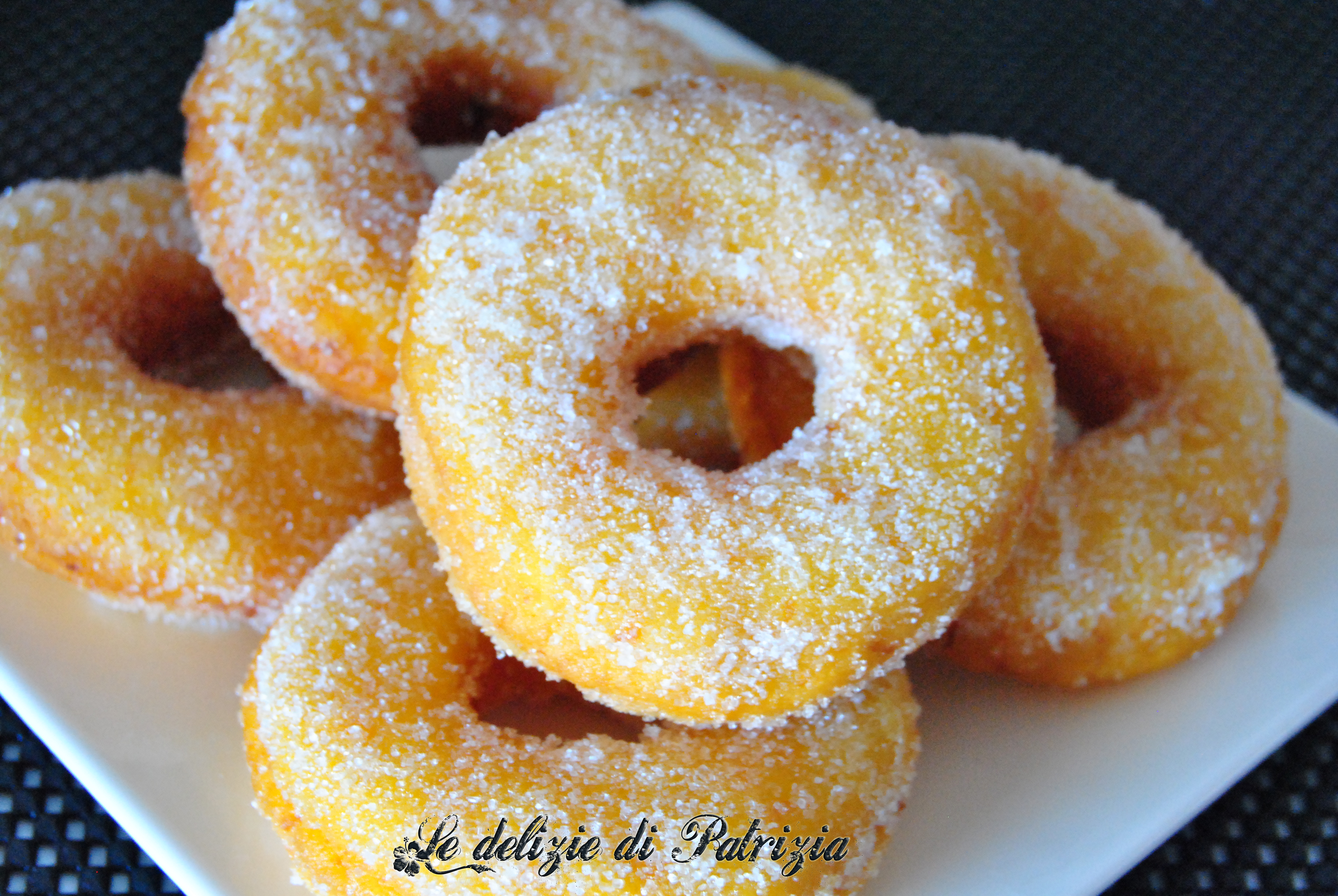 Preparazione: cuocere la zucca e con una forchetta schiacciarla ancora tiepida. In una terrina (o se l’avete usate la planetaria con il gancio) versare la farina, lo zucchero, il lievito e mischiare bene. Ora unire la zucca, il resto degli ingredienti e lavorare bene fino ad ottenere un impasto omogeneo. Potrebbe volerci un po’ più o un po’ meno di farina, dipende dall’umidità della zucca. L’impasto risulterà morbido ma deve essere così. Coprirlo con della pellicola, non a contatto, e lasciarlo lievitare per almeno un’ora (dovrà raddoppiare di volume) dentro il forno spento con la luce interna accesa. Quindi riprenderlo, stenderlo sul piano da lavoro ben infarinato (1 cm circa di spessore) e coppare dei dischi con una formina da 8 cm di diametro con il centro forato. Coprire con un canovaccio e lasciar lievitare per un’altra oretta. Friggere in abbondante olio bollente fino a doratura. Lasciar colare sulla carta assorbente e poi passarli sullo zucchero semolato. Dose per 25 ciambelle.
