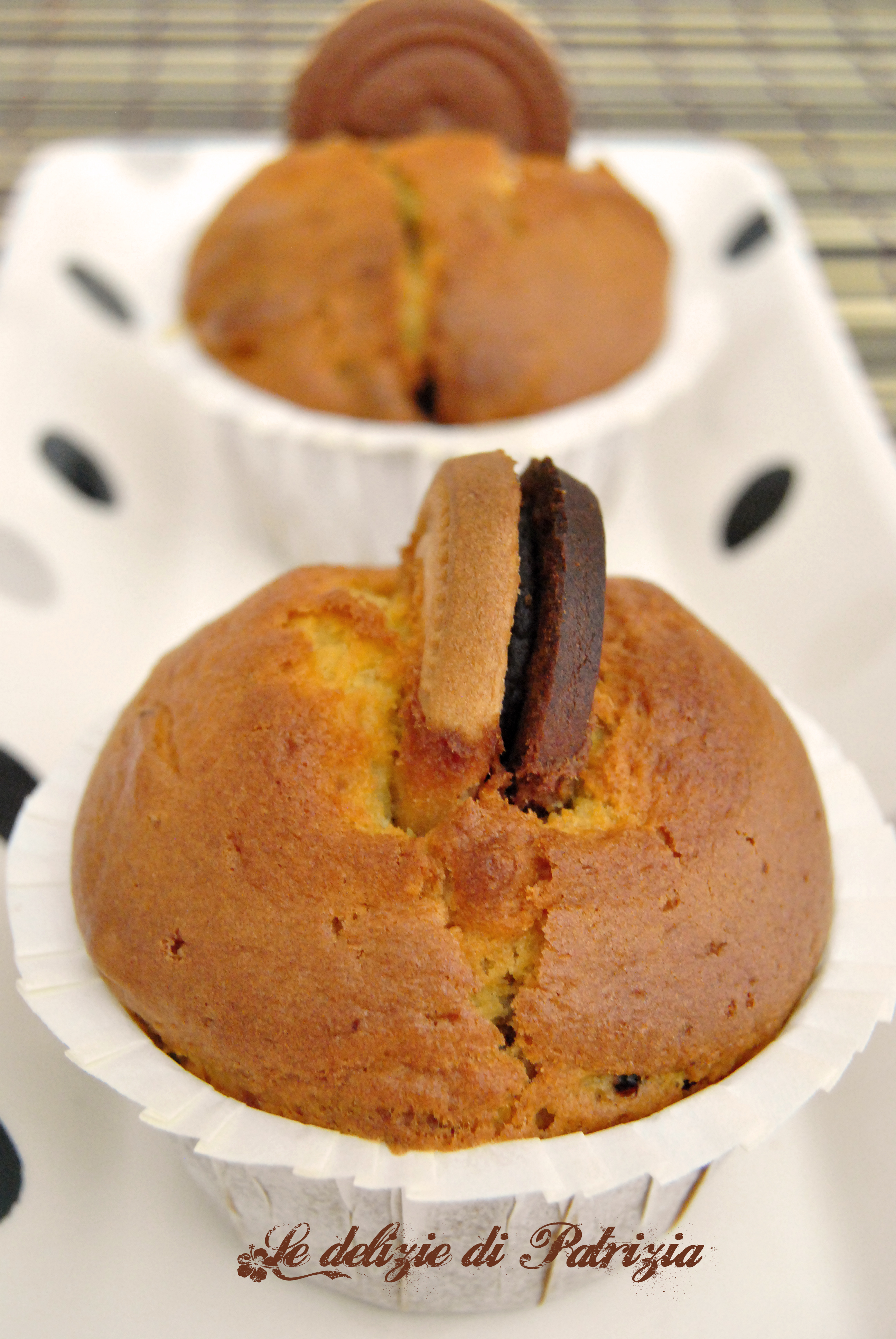 Preparazione: versare tutti i liquidi in un boccale e battere bene con una forchetta. Mettere le polveri in una terrina quindi aggiungere la parte liquida mescolando con un cucchiaio, senza preoccuparsi dei grumi. Spezzettare i 100 g di biscotti ed amalgamarli all’impasto. Riempire i pirottini (10), precedentemente sistemati nella teglia da muffin, col composto ed inserire un biscotto intero in superficie su ciascun muffin. Infornare in preriscaldato ventilato a 160° per 20 minuti.