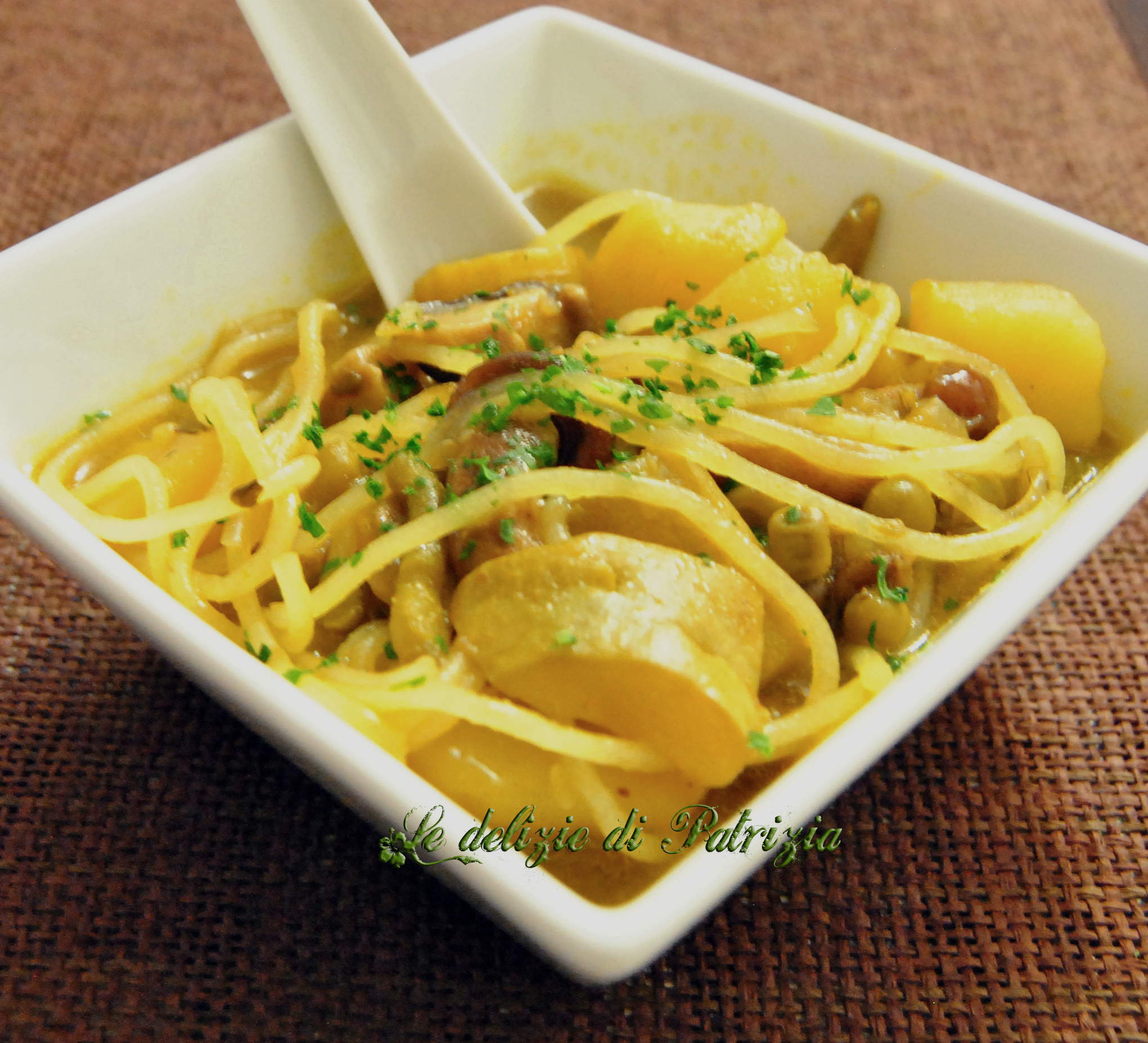 Preparazione: scaldare un po’ d’olio nel wok ( se non l’avete va bene anche una casseruola) e soffriggere dolcemente la cipolla, affettata finemente. Aggiungere cannella, curry, curcuma, cumino, peperoncino e far insaporire per un minuto circa. Buttarci dentro i funghi spezzettati, le foglie di timo, il prezzemolo e procedere a fuoco vivace ma facendo attenzione che non si brucino le cipolle. Dopo qualche minuto di cottura aggiungere il latte di cocco, lo zucchero, la soia ed infine il brodo vegetale. Immergere la patata e la zucchina, precedentemente tagliate a cubotti, salare (non troppo perché abbiamo già la sapidità della soia), coprire e lasciar sobbollire fino a completa cottura delle verdure. Procedere con la cottura dei noodles come da istruzioni. Servire con del prezzemolo fresco e un giro d’olio a crudo.