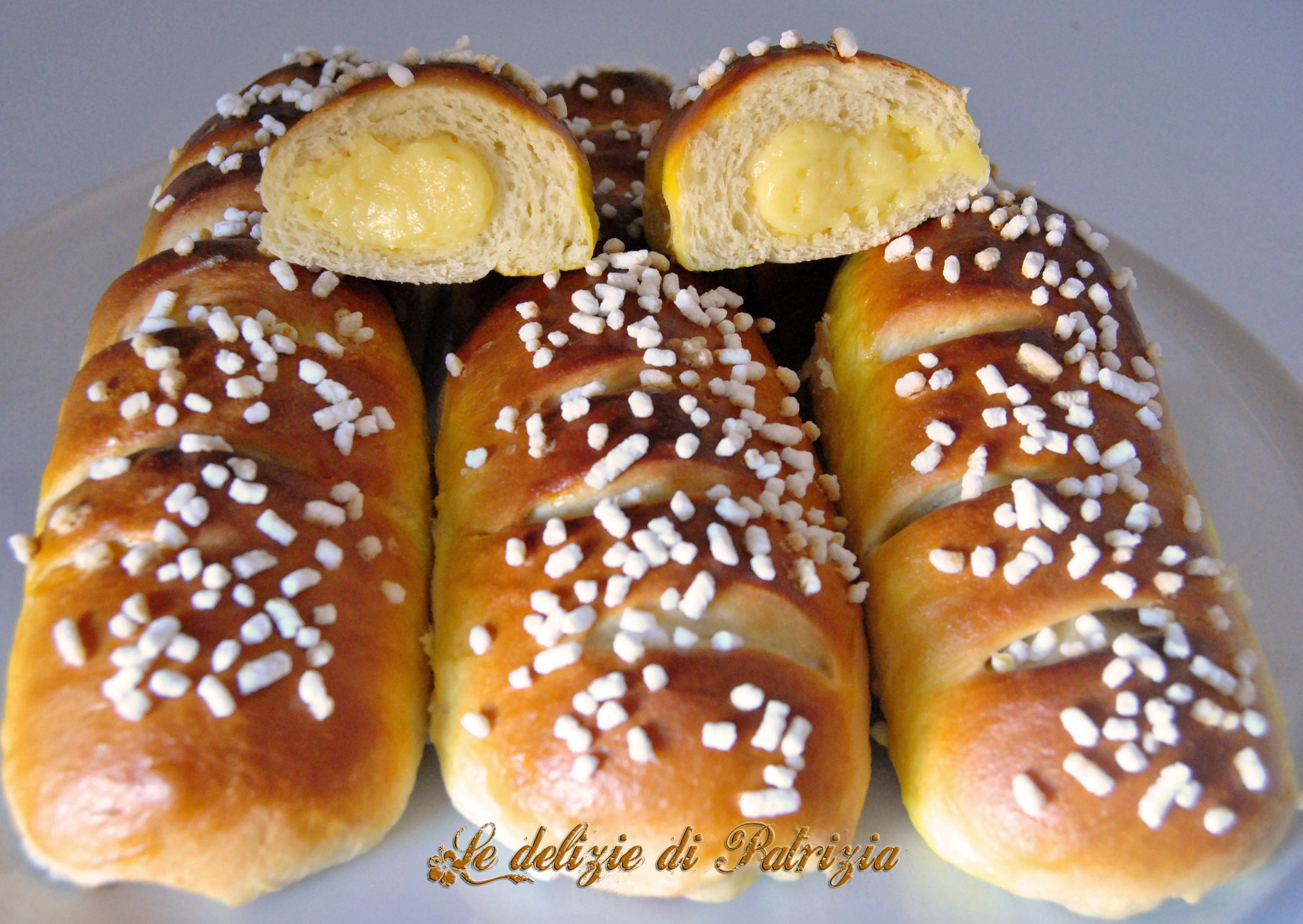 Preparazione: mettere la farina, il lievito e lo zucchero in planetaria e miscelare bene. In un boccale versare il latte, le uova, la vaniglia, la scorza e battere il tutto con una forchetta. Azionare la macchina, munita di gancio, e versare pian piano tutto il liquido. Lasciar lavorare una decina di minuti poi inserire poco per volta il burro a fiocchetti ed il sale come ultimo ingrediente. Far lavorare ancora una decina di minuti poi rovesciare l’impasto sul piano di lavoro leggermente unto e ripiegarlo più volte su se stesso. Ora trasferirlo in una terrina coperta con pellicola trasparente, non a contatto, e mettere a lievitare dentro il forno spento con la luce interna accesa. Dopo due ore circa (l’impasto dovrà raddoppiare il suo volume), rovesciarlo sul piano di lavoro infarinato, stenderlo col mattarello (poco meno di 1 cm di spessore) e tagliare dei quadrati, più o meno tutti della stessa pezzatura, bagnarsi un dito con dell’acqua e passarlo su tutti i bordi. Incidere tre righe da un lato, farcire il lato opposto con una bella striscia di crema pasticcera (usate la saccapoche con bocchetta liscia, sarà più semplice) e rotolate fino a chiudere per bene. Pizzicare le estremità per sigillare la pasta e disporre (avendo cura di mettere la parte della chiusura di sotto) sulla placca, foderata di carta forno, distanziate l’una dall’altra. Ne ho riempito due placche (15 brioches belle grandette). Rimettere le placche dentro il forno (con lucetta accesa) e lasciar lievitare per un’altra oretta. Battere con la forchetta il tuorlo con la panna e spennellare tutte le brioches poi ricoprirle di granella di zucchero. Infornare in preriscaldato statico a 180° per 20 minuti.