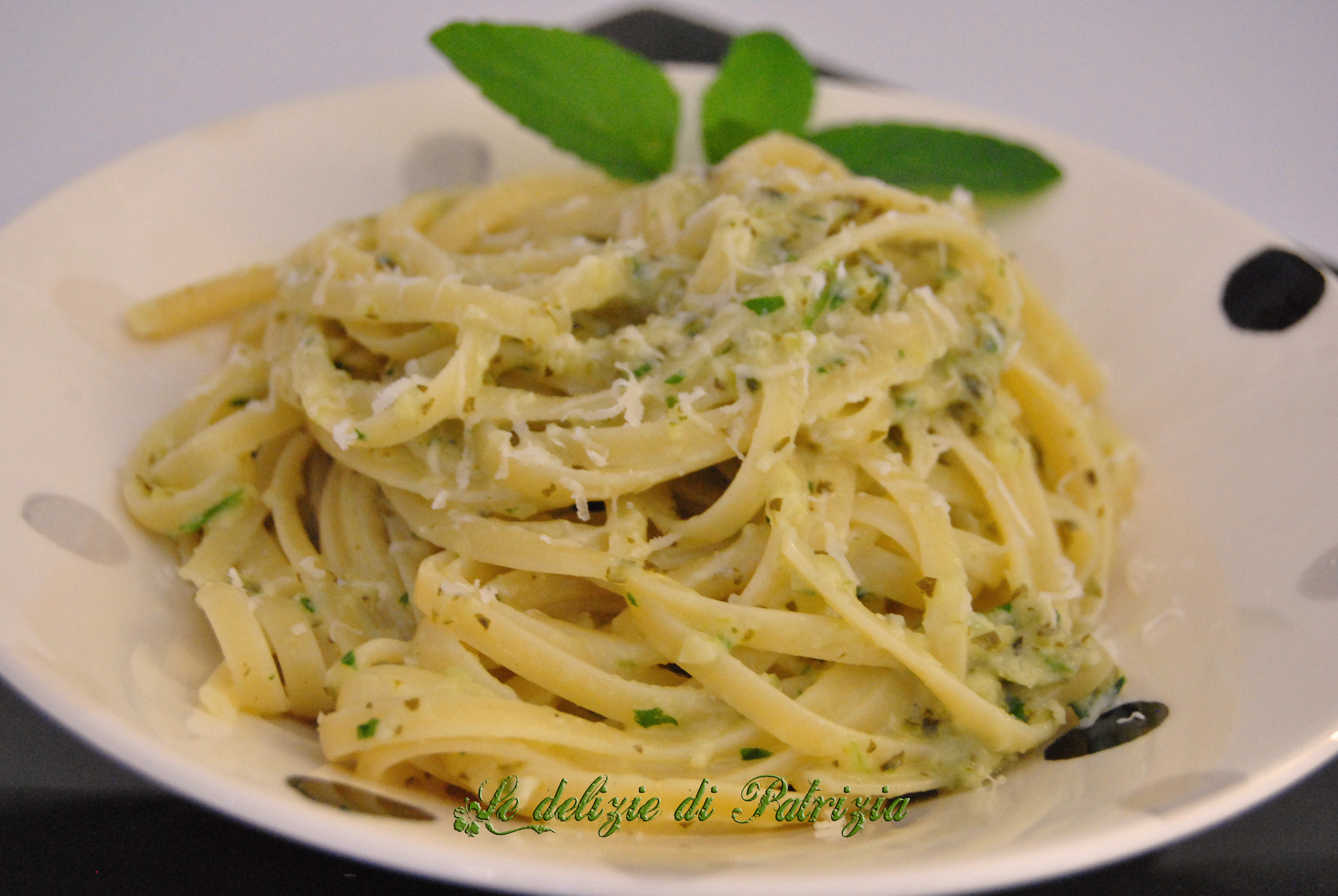 Preparazione: tagliare a rondelle sottili il cipollotto e farlo soffriggere dolcemente in un fondo d’olio caldo. Aggiungere le zucchine ridotte a cubetti e, dopo una rapida rosolatura, bagnarle col vino bianco. Salare, pepare, unire le foglie di menta, il prezzemolo, mettere il coperchio, abbassare la fiamma e far cuocere per una decina di minuti. Quando la zucchina risulterà morbida e il liquido di vegetazione sarà quasi completamente assorbito, spegnere e lasciar raffreddare. Trasferire le zucchine nel bicchiere del mixer, aggiungere i pinoli, il parmigiano, un cucchiaio d’olio, ancora qualche foglia di menta e frullare fino ad ottenere una salsa bella liscia. Se si desidera un pesto più fluido sarà sufficiente aggiungere qualche cucchiaio d’acqua di cottura e frullare ancora. Cuocere la pasta e condirla col preparato. Dose per 4-5 persone.