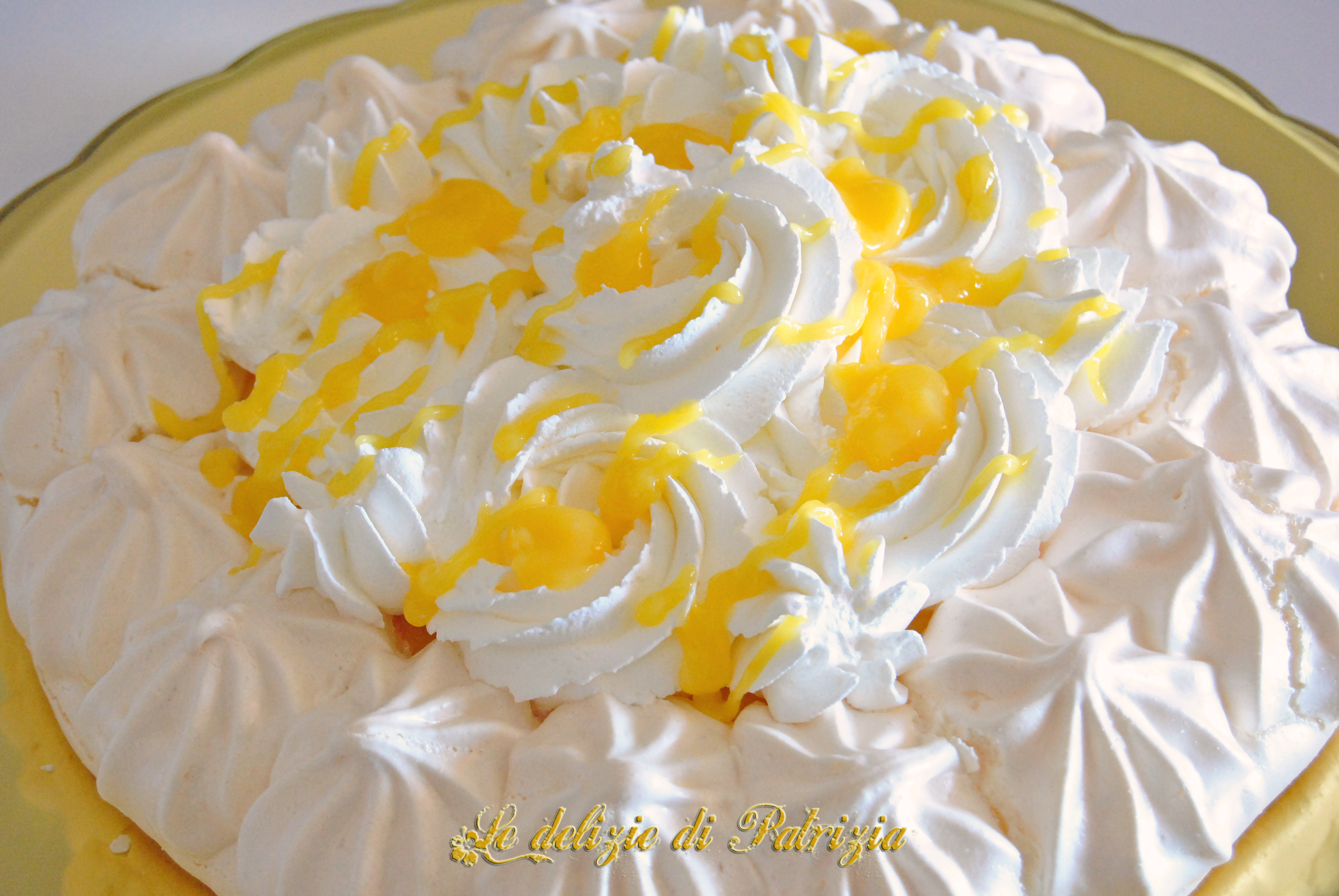 Quando la pavlova sarà cotta e ben fredda farcirla prima con uno strato di lemon curd poi con dei ciuffi di panna montata, infine decorare con delle strisce di lemon curd.