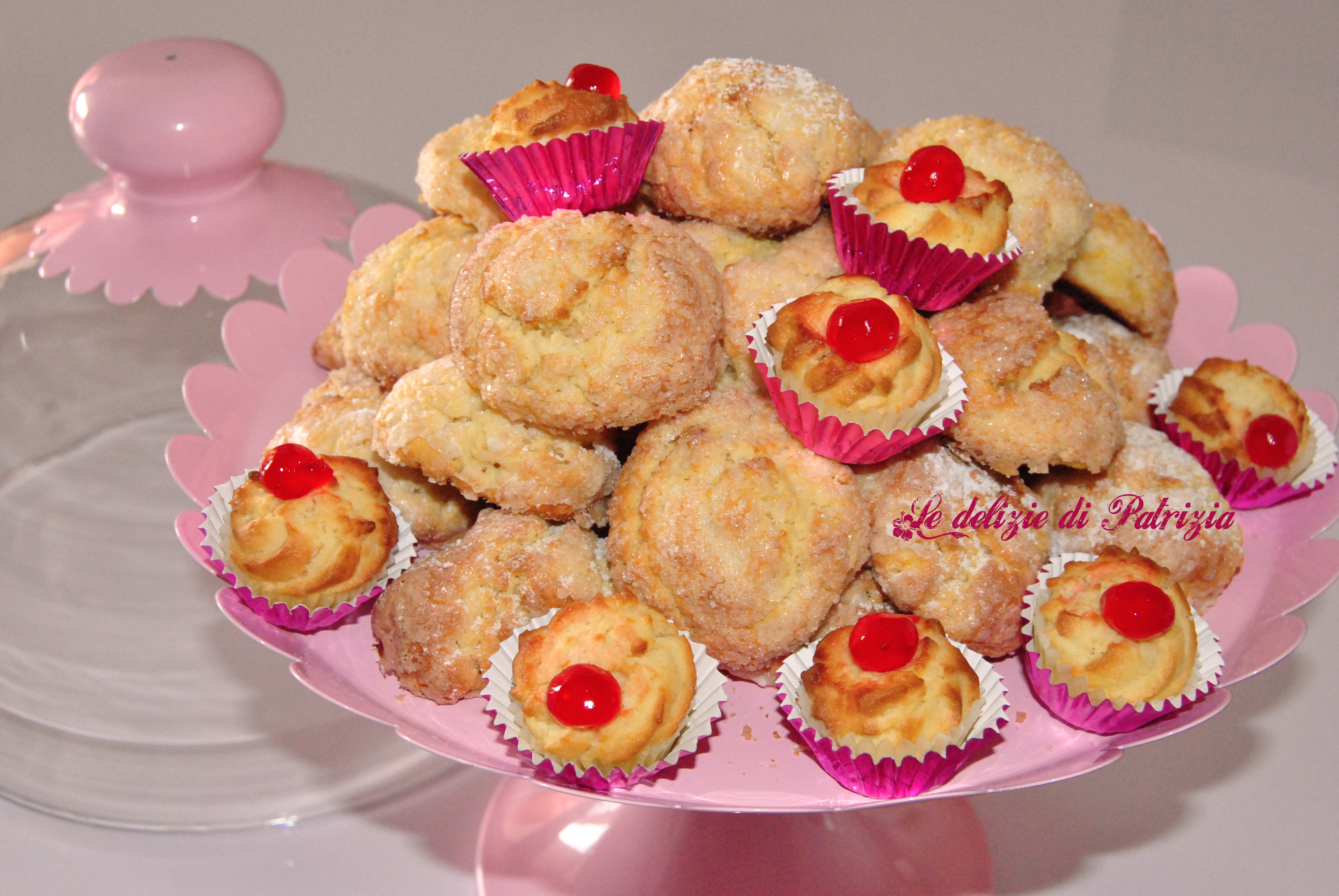 Preparazione: impastare tutti gli ingredienti, a mano o in planetaria, e mettere il composto ottenuto (chiuso nella pellicola o nella carta forno) in frigo per almeno un’oretta. L’impasto sembrerà appiccicoso ma non aggiungere farina. Trascorso il tempo, prendere dei pezzi di impasto, della grandezza di una noce, formare delle palline, passarle nello zucchero semolato o nello zucchero a velo e disporle nella placca foderata di carta forno (ne ho riempito due placche). Infornare in preriscaldato ventilato a 160° per 15 minuti. Quelli piccini li ho ottenuti mettendo l’impasto nella sacca poche, munita di bocchetta a stella, e facendo dei ciuffetti dentro i pirottini, ho applicato poi una ciliegina al centro (la loro cottura è di 10 minuti).