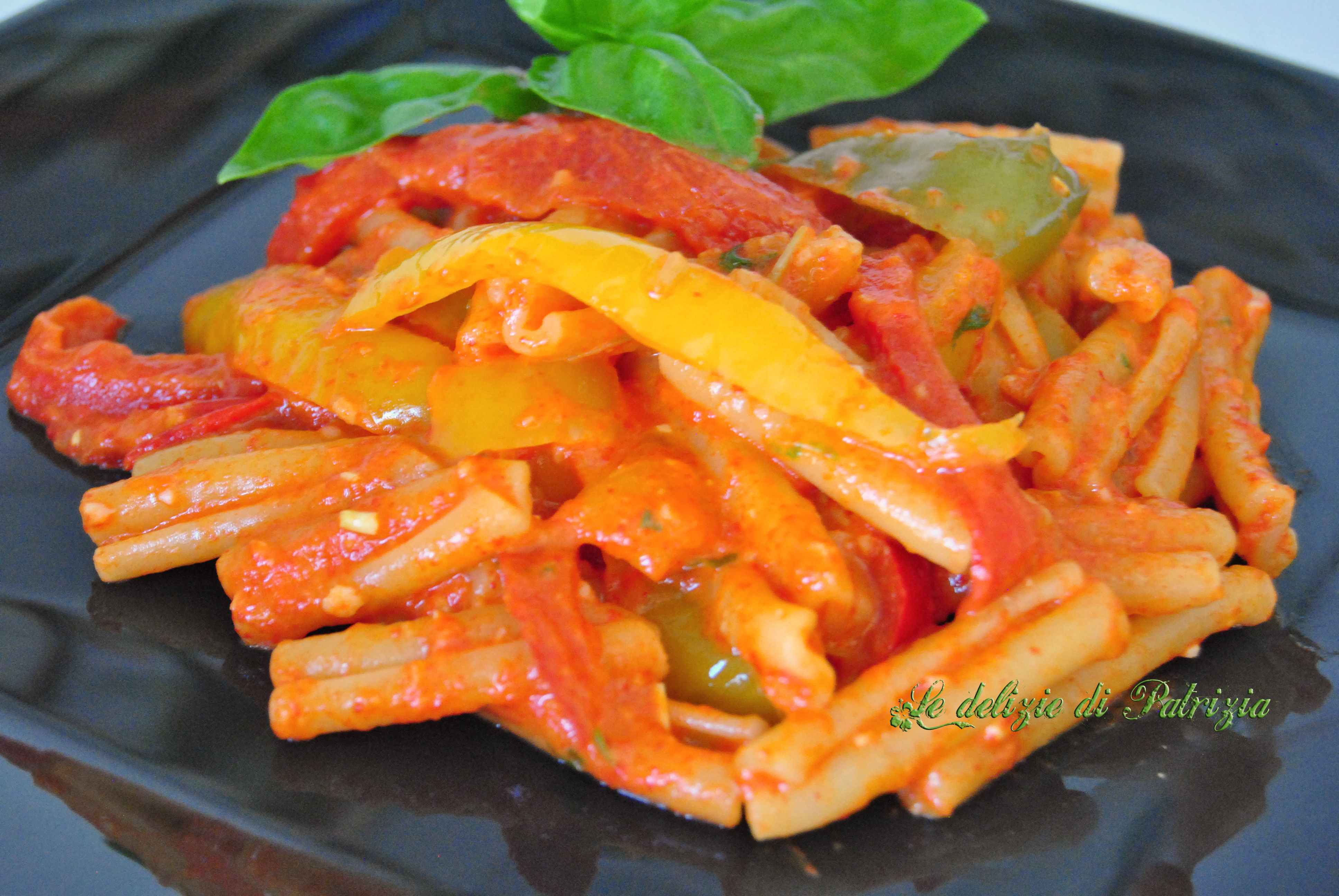 In un’ampia padella scaldare alcuni cucchiai d’olio e far rosolare lo scalogno tritato finemente e l’aglio intero. Aggiungere il peperone, precedentemente tagliato a filetti, salare, coprire e cuocere a fuoco delicato per una decina di minuti. Mettere a cuocere le caserecce in abbondante acqua salata e nel frattempo spellare i peperoni, ormai freddi, eliminare i semini e metterli nel bicchiere da mix. Aggiungere due cucchiai d’olio, il basilico, i pistacchi, un mestolo d’acqua di cottura della pasta ed emulsionare il tutto fino ad ottenere una bella cremina. Scolare la pasta, saltarla un minuto in padella col peperone a filetti, aggiungere il pesto e, se necessario, ancora due cucchiai d’acqua di cottura. Dose per quattro persone.