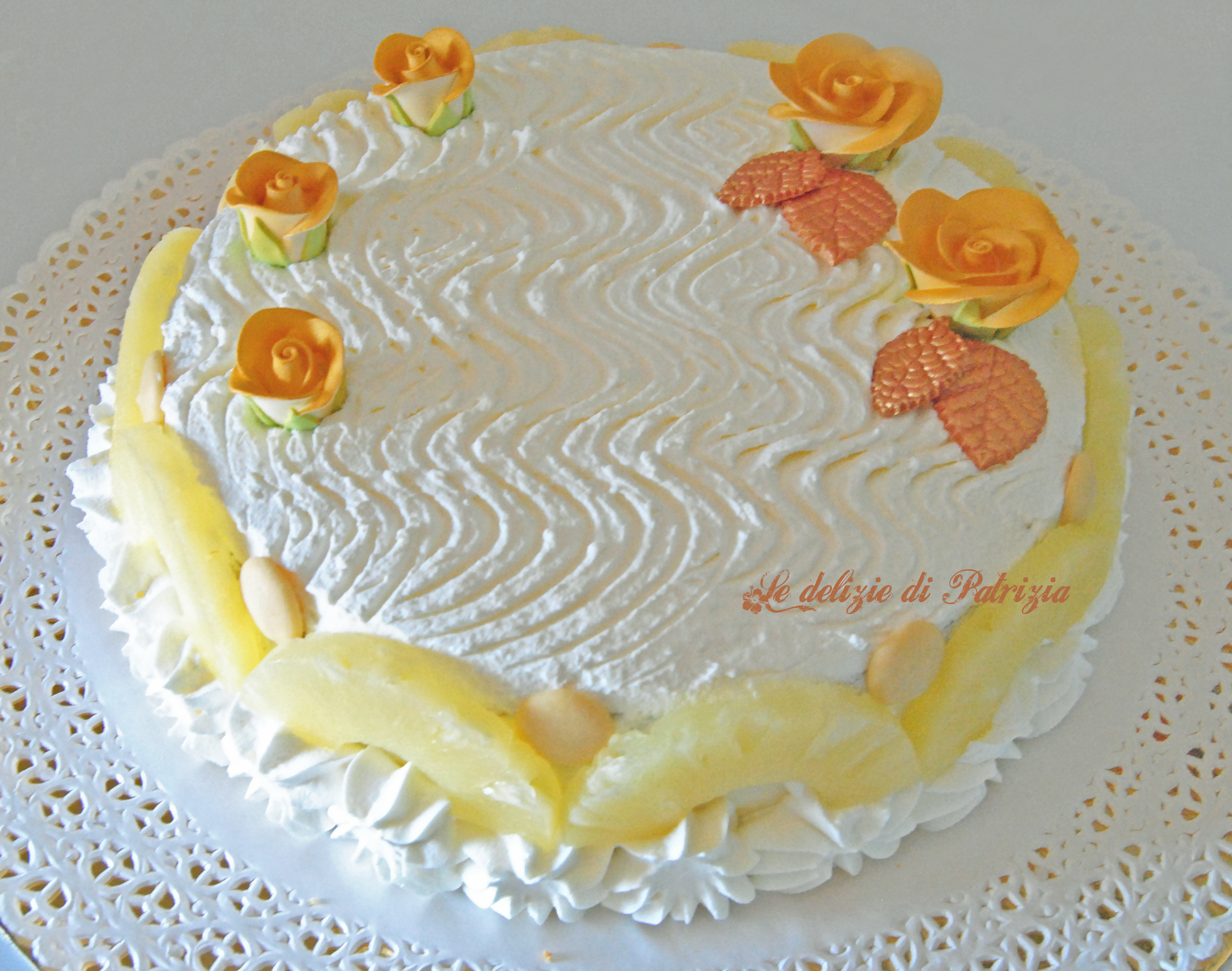 Preparazione: dividere il pds in due dischi, spennellare, sotto e sopra, con la bagna, farcire con la crema quindi cospargere di ananas a pezzetti. Coprire con secondo disco, spatolare tutto l’esterno della torta con la crema diplomatica quindi decorare con panna montata e ananas.