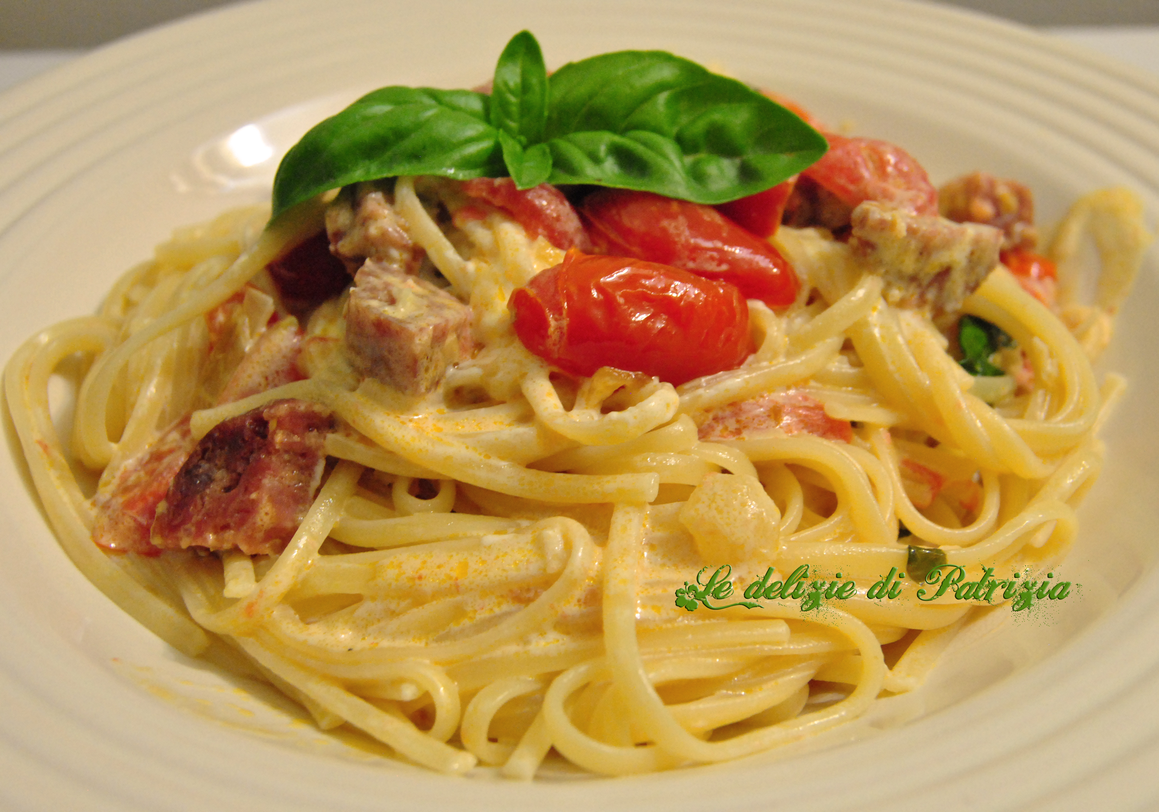 Preparazione: scaldare un filo d’olio in un’ampia padella e far rosolare lo scalogno tritato insieme al cacciatorino tagliato a dadini. Aggiungere i pomodorini, tagliati a metà, qualche foglia di basilico e condire di sale (pochissimo perché c’è già la sapidità del salamino e del formaggio). Saltare a fuoco vivo per alcuni minuti quindi spegnere il fornello ed unire la robiola che necessiterà di una tazzina d’acqua di cottura della pasta per diventare cremosa ed incorporarsi al resto degli ingredienti. Cuocere le linguine e condirle (saltandole un minuto in padella) con il preparato quindi aggiungere il pepe.